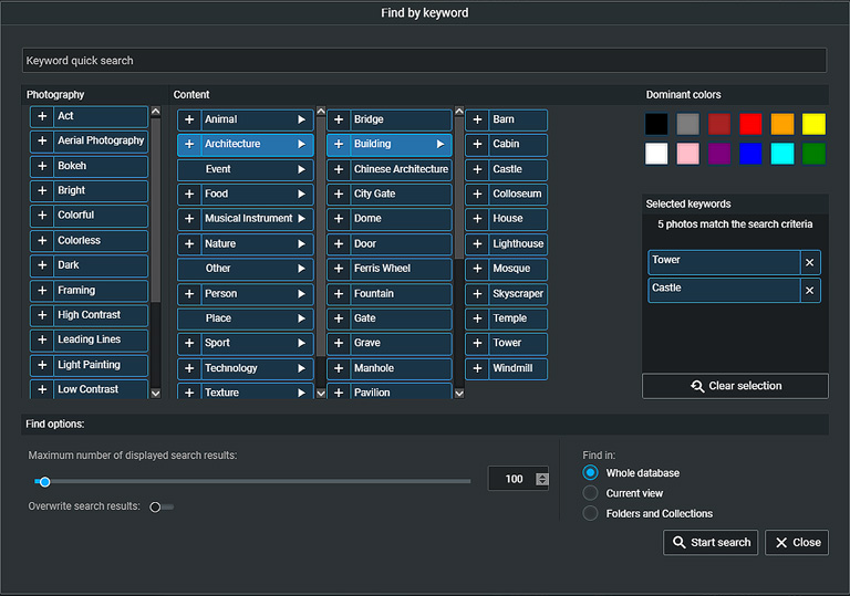 If you have Lightroom Classic, I recommend you use the Excire Search plugin rather than the standalone app. This way, the searching and organizing function work within Lightroom. Similar to the Excire Foto app, you will first have to initialize your photos and let the plugin analyze them and assign suggested keywords. The database will automatically be placed in the same location as your Lightroom catalog.